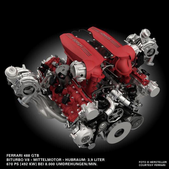 Durch die Turbo-Zwangsbeatmung kommt der V8 des neuen 488 GTB bei relativ kleinem Hubraum auf unglaubliche 492 kW/670 PS Leistung.